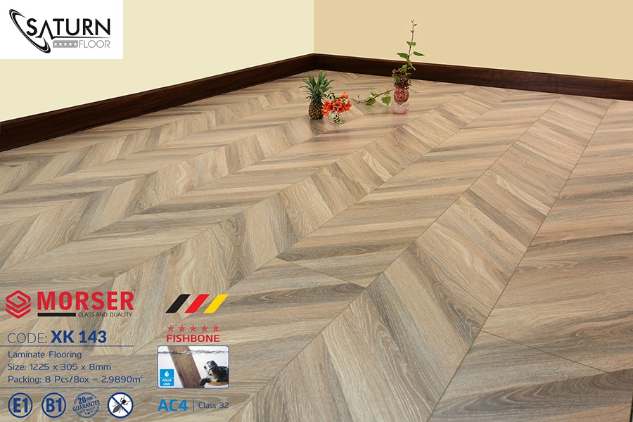 - Sàn gỗ Morse Xương Cá XK143 cao cấp được sản xuất trên dây truyền công nghệ hiện đại của CHLB Đức, cốt gỗ xanh, hàm lượng HCHO (Formaldehyde) thấp đạt tiêu chuẩn Châu Âu E1 an toàn cho sức khỏe người sử dụng.
