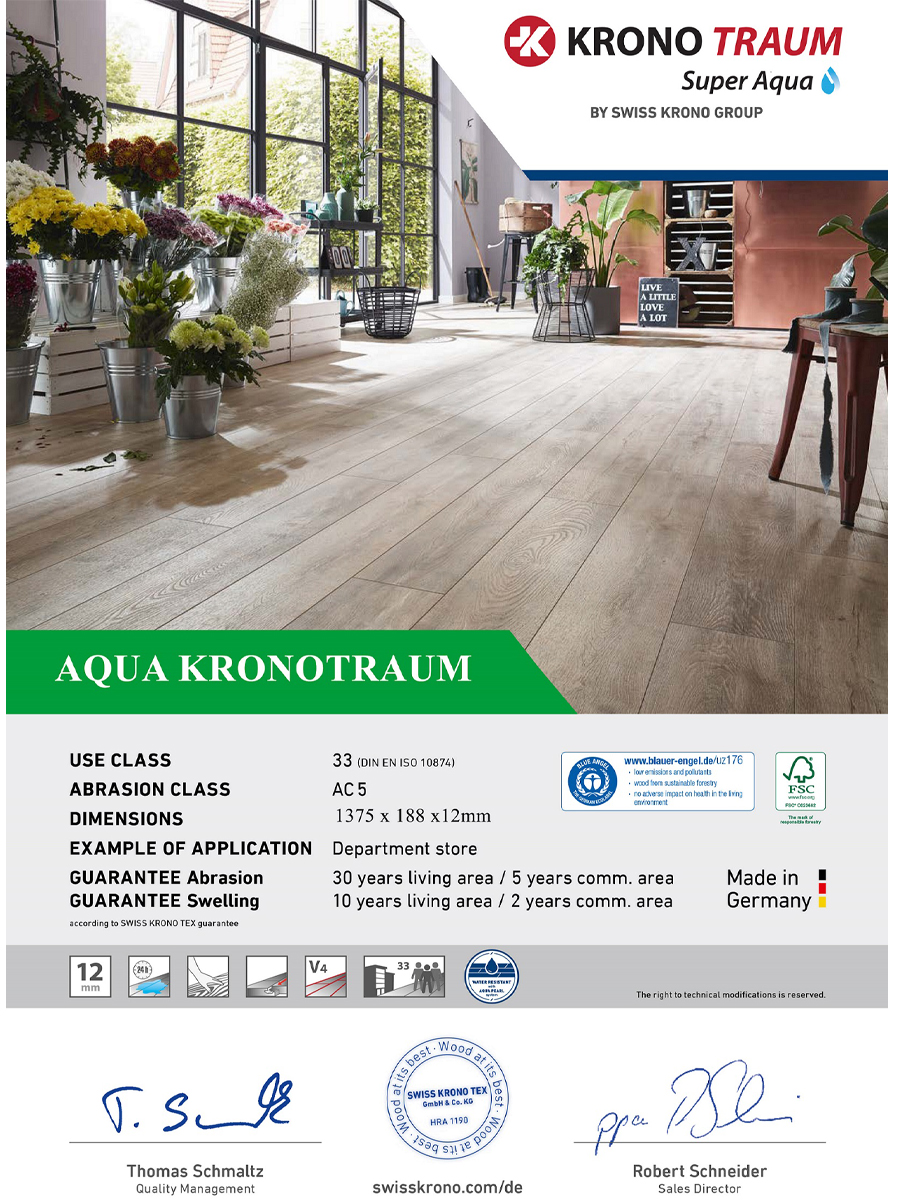 Sàn gỗ công nghiệp Krono Traum Aqua thuộc tập đoàn Swiss Krono Group đại diện cho phân khúc ván lót sàn cao cấp, hiện đại nhập khẩu từ Đức. Sàn gỗ Kronotraum Aqua tạo ra một xu hướng mới với phong cách mạnh mẽ và cá tính cho các không gian nội thất nhà ở cao cấp. Sản phẩm được tạo ra bằng các loại vật liệu gỗ tự nhiên thân thiện với môi trường đáp ứng cho mọi nhu cầu của người tiêu dùng từ nhà ở cho đến các công trình công cộng, lót sàn cho các dự án cao cấp.